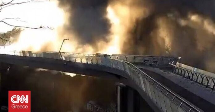 Στις εικόνες φαίνεται η περιοχή γύρω από μια γέφυρα να τυλίγεται στις φλόγες: