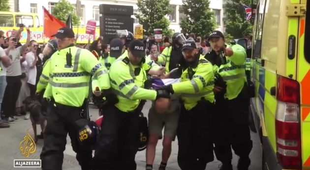 Στο Μπέλφαστ καίγεται κτίριο. Στο Λίβερπουλ η αστυνομία βρίσκεται ανάμεσα σε ακροδεξιούς και αντιφασίστες. Aκροδεξιός πέφτει στα χέρια των αστυνομικών και προσπαθεί να τους χτυπήσει με το κεφάλι.