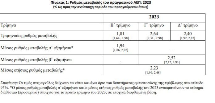 «Σύμφωνα με τις επικαιροποιημένες προβλέψεις του υποδείγματος παραγόντων του Κέντρου Προγραμματισμού και Οικονομικών Ερευνών (ΚΕΠΕ), ο μέσος ετήσιος ρυθμός μεταβολής του πραγματικού Ακαθάριστου Εγχώριου Προϊόντος (ΑΕΠ) της Ελλάδας για το έτος 2023 προβλέπεται στο 2,2%. Η εκτίμηση αυτή ταυτίζεται με τη σχετική πρόβλεψη που δημοσίευσε το ΚΕΠΕ στις αρχές του έτους (2,2%), δεδομένου ότι δεν σημειώθηκαν στο ενδιάμεσο διάστημα εξελίξεις που να ανατρέπουν τη θετική πορεία των περισσότερων από τα οικονομικά μεγέθη που ενσωματώνονται στην πρόβλεψη. Σύμφωνα με την εκτίμηση, η ελληνική οικονομία θα παραμείνει σε σταθερή τροχιά ανάπτυξης καθ’ όλη τη διάρκεια του έτους, με τους ρυθμούς μεγέθυνσής της να έχουν επανέλθει σε επίπεδα που αντανακλούν την μεταπανδημική επιστροφή στην κανονικότητα » σημειώνει το ΚΕΠΕ.