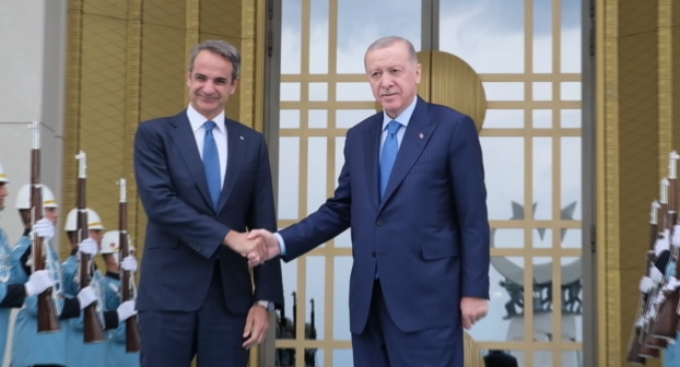 Στο Προεδρικό Μέγαρο, ο Ταγίπ Ερντογάν, κατεβαίνει τα σκαλιά για να υποδεχθεί τον Έλληνα πρωθυπουργό. Είναι η πρώτη φορά που ο Κυριάκος Μητσοτάκης επισκέπτεται το λευκό «παλάτι» στην Άγκυρα και ο Ερντογάν που επιφύλαξε θερμή υποδοχή.