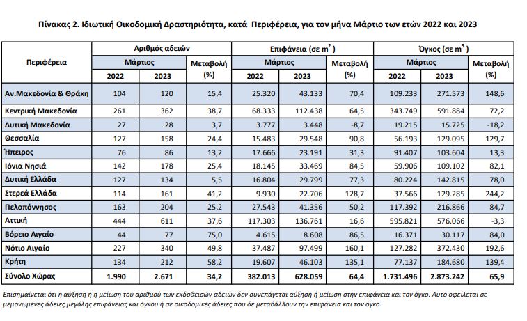 επιφάνειας και 2.873.242 m3 όγκου, παρουσιάζοντας αύξηση κατά 34,2% στον αριθμό των οικοδομικών αδειών, αύξηση κατά 64,4% στην επιφάνεια και αύξηση κατά 65,9% στον όγκο, σε σχέση με τον αντίστοιχο μήνα του 2022.