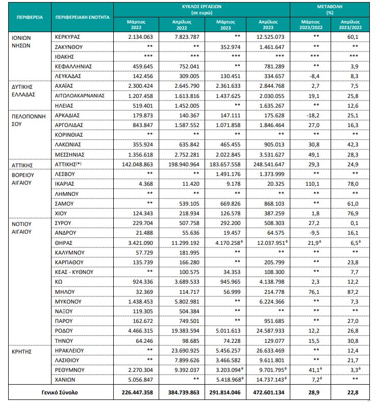 - Για τις Περιφερειακές Ενότητες με συνεισφορά στον συνολικό κύκλο εργασιών έτους 2022 μεγαλύτερη από 1,0% (Πίνακας 1), η μεγαλύτερη αύξηση στον κύκλο εργασιών τον Απρίλιο 2023 σε σύγκριση με τον Απρίλιο 2022 παρατηρήθηκε στην Περιφερειακή Ενότητα Κέρκυρας (60,1%) και η μικρότερη αύξηση (7,3%) καταγράφηκε στην Περιφερειακή Ενότητα Μυκόνου.