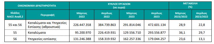 ευρώ . - Αθροιστικά για τις επιχειρήσεις στους κλάδους των Καταλυμάτων και των Υπηρεσιών Εστίασης (κλάδοι 55 και 56 της ταξινόμησης NACE Αναθ. 2), με υποχρέωση τήρησης διπλογραφικών βιβλίων, για τις οποίες υπάρχουν διαθέσιμα στοιχεία σε μηνιαία βάση, ο κύκλος εργασιών τον Απρίλιο 2023 ανήλθε σε 472.601.134 ευρώ, σημειώνοντας αύξηση 22,8% σε σχέση με τον Απρίλιο 2022, όπου είχε ανέλθει σε 384.739.863 ευρώ.