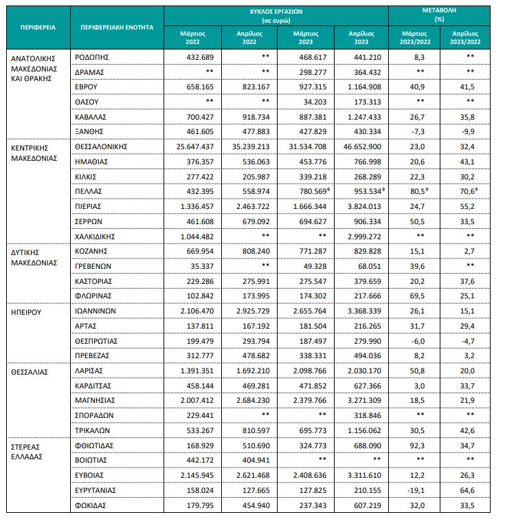 Διευκρινίζεται πως αυτό αφορά στις επιχειρήσεις που έχουν υποχρέωση τήρησης διπλογραφικών βιβλίων και για τις οποίες υπάρχουν διαθέσιμα στοιχεία. Δηλαδή ο τζίρος των παραπάνω επιχειρήσεων αυξήθηκε σχεδόν κατά 67,14 εκατ. ευρώ τον Απρίλιο 2923 και ανήλθε σε 293.556.877 ευρώ, έναντι των 226.419.931 ευρώ τον Απρίλιο 2022.