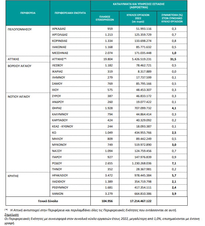 Πίνακας 1: Ετήσιος κύκλος εργασιών επιχειρήσεων αθροιστικά στους κλάδους των Καταλυμάτων και των Υπηρεσιών Εστίασης (κλάδοι 55 και 56 της ταξινόμησης NACE Αναθ. 2) ανά Περιφέρεια και Περιφερειακή Ενότητα, 2022