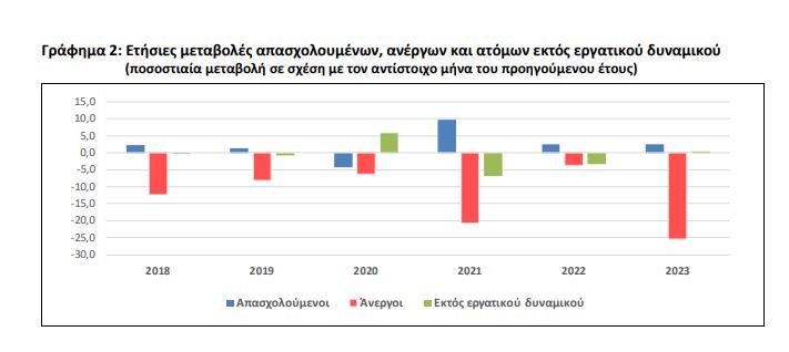 Ενώ, τα άτομα κάτω των 75 ετών που δεν περιλαμβάνονται στο εργατικό δυναμικό, ή «άτομα εκτός του εργατικού δυναμικού» (τα άτομα που δεν εργάζονται ούτε αναζητούν εργασία), ανήλθαν σε 3.093.407 άτομα, σημειώνοντας αύξηση κατά 14.960 άτομα σε σχέση με τον Δεκέμβριο 2022 (0,5%) και μείωση κατά 99.249 άτομα σε σχέση με τον Νοέμβριο 2023 (3,1%).