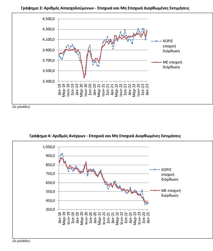 Οι άνεργοι ανήλθαν σε 430.088 άτομα, σημειώνοντας μείωση κατά 146.424 άτομα σε σχέση με τον Δεκέμβριο 2022 (25,4%) και κατά 746 άτομα σε σχέση με τον Νοέμβριο 2023 (0,2%).