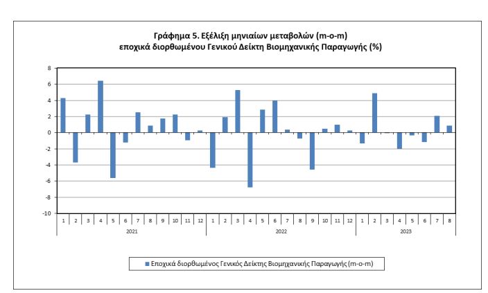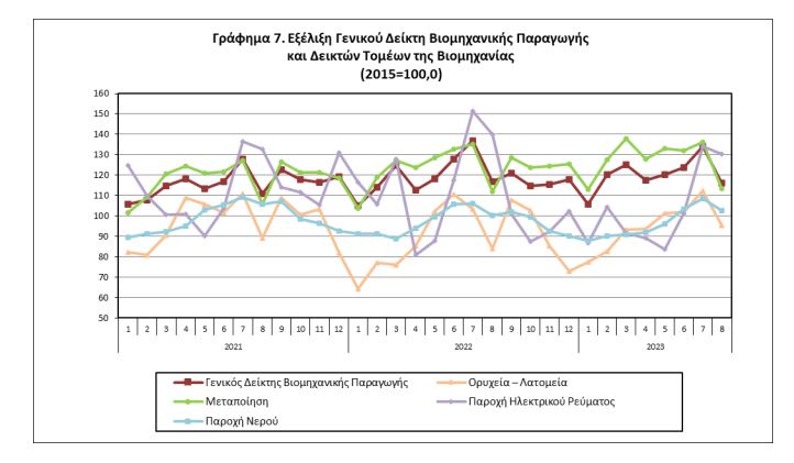 Όπως έδειξαν τα στοιχεία της Αρχής, ο γενικός δείκτης βιομηχανικής παραγωγής παρουσίασε μείωση 0,5% τον Αύγουστο 2023 σε σύγκριση με τον αντίστοιχο δείκτη του Αυγούστου 2022, έναντι αύξησης 5,1% που σημειώθηκε κατά την αντίστοιχη σύγκριση το 2022 με το 2021. Η εξέλιξη αυτή, προήλθε από τις ακόλουθες μεταβολές των δεικτών των επιμέρους τομέων βιομηχανίας: