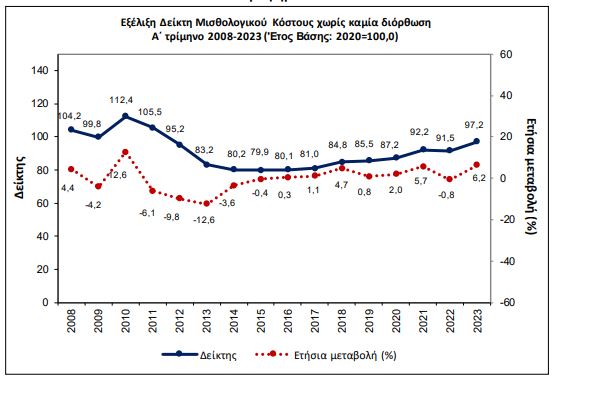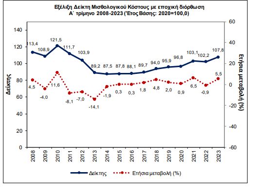 Γράφημα: Εξέλιξη Δείκτη Μισθολογικού Κόστους: A’ τρίμηνο 2008 – Α’ τρίμηνο 2023