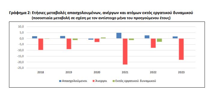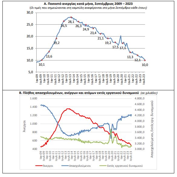 Οι άνεργοι ανήλθαν σε 467.804 άτομα, σημειώνοντας μείωση κατά 104.240 άτομα σε σχέση με τον Σεπτέμβριο 2022 (18,2%) και κατά 24.549 άτομα σε σχέση με τον Αύγουστο 2023 (5%).