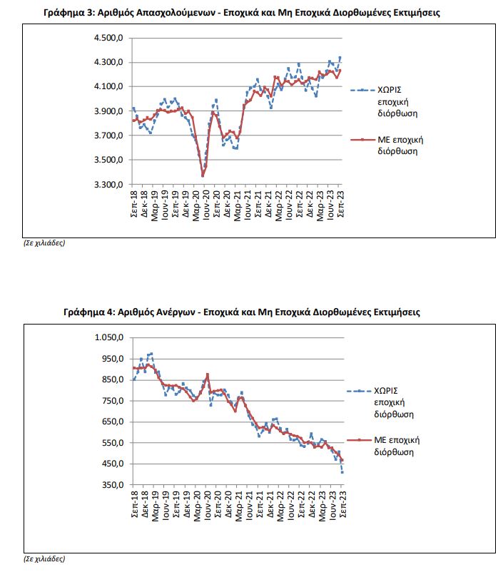 Σύμφωνα επίσης με την έρευνα εργατικού δυναμικού της ΕΛΣΤΑΤ, οι απασχολούμενοι ανήλθαν σε 4.226.711 άτομα, σημειώνοντας αύξηση κατά 70.724 άτομα σε σχέση με τον Σεπτέμβριο 2022 (1,7%) και κατά 55.173 άτομα σε σχέση με τον Αύγουστο 2023 (1,3%).