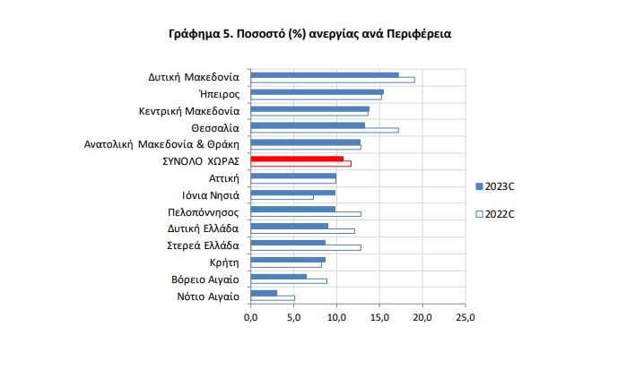 Τα υψηλότερα ποσοστά ανεργίας παρατηρούνται στις Περιφέρειες Δυτικής Μακεδονίας και Ηπείρου ενώ το χαμηλότερο στην Περιφέρεια Νοτίου Αιγαίου