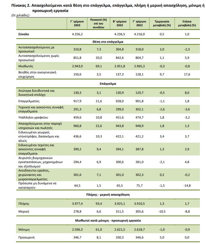 Κατά το Γ΄ τρίμηνο του 2023, το μεγαλύτερο ποσοστό των απασχολουμένων εργάζονται ως μισθωτοί (69,1%), ενώ σημαντικό είναι και το ποσοστό των αυτοαπασχολουμένων χωρίς προσωπικό (20,0%). Το ποσοστό μερικής απασχόλησης ανέρχεται σε 6,6%, ενώ το ποσοστό των ατόμων που έχουν προσωρινή εργασία σε 8,1%. Η μερική απασχόληση εμφανίζει μείωση κατά 10,5% σε σχέση με το προηγούμενο τρίμηνο και κατά 8,8% σε σχέση με το αντίστοιχο τρίμηνο του προηγούμενου έτους. Η προσωρινή απασχόληση έχει αυξηθεί κατά 5,0% σε σχέση με το προηγούμενο τρίμηνο, ενώ παρέμεινε σταθερή σε σχέση με το αντίστοιχο τρίμηνο του προηγούμενου έτους.