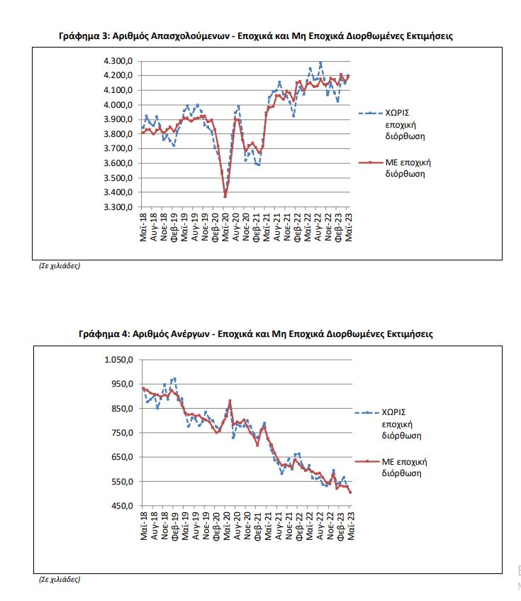 Σύμφωνα επίσης με την έρευνα εργατικού δυναμικού της ΕΛΣΤΑΤ, οι απασχολούμενοι ανήλθαν σε 4.186.179 άτομα, σημειώνοντας αύξηση κατά 45.901 άτομα σε σχέση με τον Μάιο 2022 (1,1%) και κατά 22.512 άτομα σε σχέση με τον Απρίλιο 2023 (0,5%).