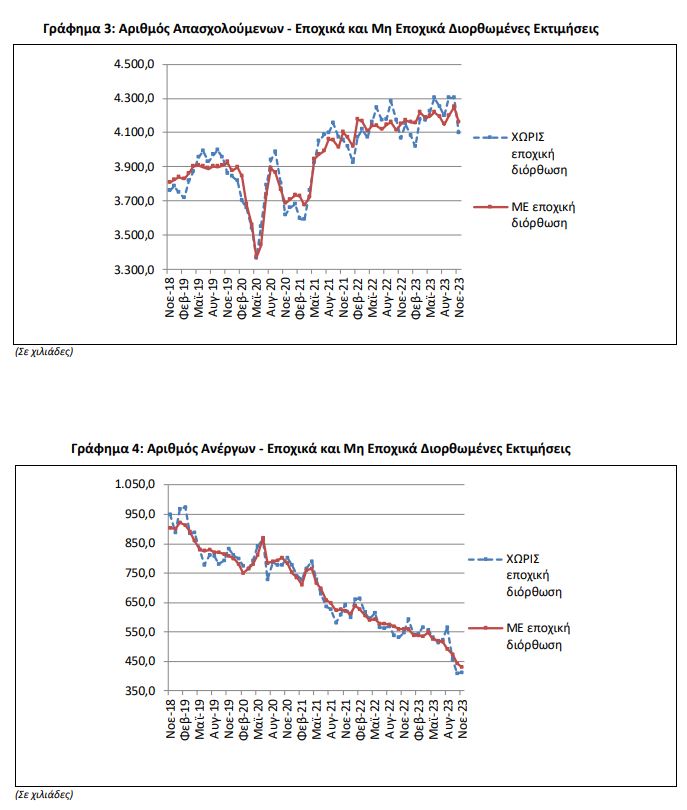 • Οι απασχολούμενοι ανήλθαν σε 4.161.930 άτομα σημειώνοντας αύξηση κατά 12.025 άτομα σε σχέση με τον Νοέμβριο του 2022 (0,3%) και μείωση κατά 87.722 άτομα σε σχέση με τον Οκτώβριο του 2023 (-2,1%).