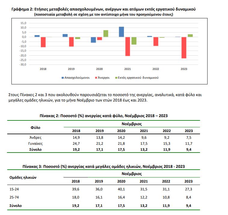 • Οι άνεργοι ανήλθαν σε 429.806 άτομα σημειώνοντας μείωση κατά 130.997 άτομα σε σχέση με τον Νοέμβριο του 2022 (-23,4%) και κατά 12.156 άτομα σε σχέση με τον Οκτώβριο του 2023 (-2,8%).
