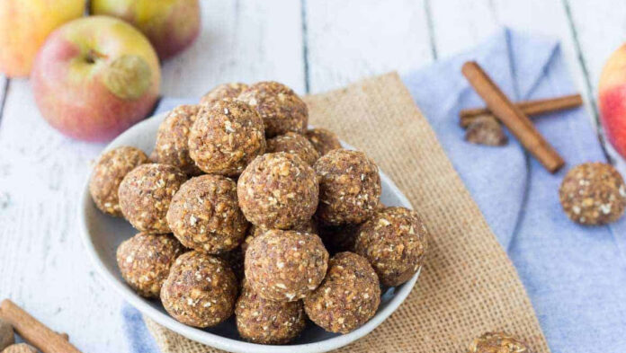 Σε μπλέντερ βάλτε τις νιφάδες βρώμης, τα αποξηραμένα μήλα, το βούτυρο αμυγδάλου και τους μουλιασμένους χουρμάδες και χτυπήστε τα μέχρι να κοπούν πολύ ψιλά.