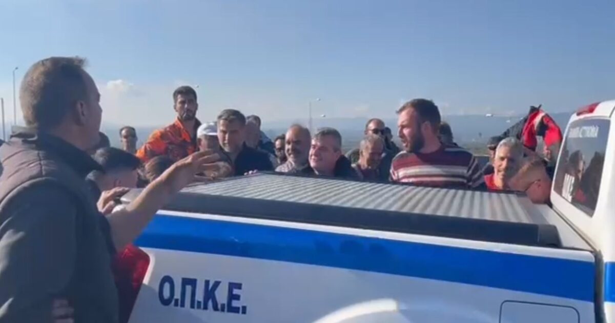 Για κάποια λεπτά δημιουργήθηκε ένταση με τους αγρότες να προσπαθούν να αναποδογυρίσουν παρόμοιο όχημα με αυτό που είχαν τουμπάρει οι συνάδελφοι τους στην Κρήτη.