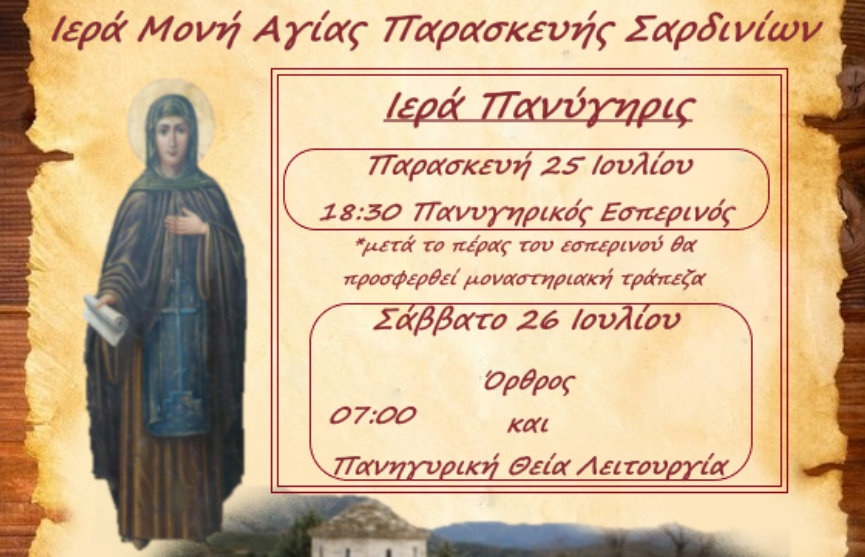 Η Ιερά Μονή Αγίας Παρασκευής Σαρδινίων έχει “ζωντανέψει” ξανά εδώ και δύο χρόνια με τις άοκνες προσπάθειες του πατρός Ζαχαρία που εγκαταβιεί στο μοναστήρι. Πλέον σιγά σιγά έχει αποτελέσει λίκνο πνευματικότητας αλλά και πνευματικό κέντρο της περιοχής και όχι μόνο. Η αγάπη των κατοίκων των γύρω περιοχών είναι έκδηλη προς το μοναστήρι αλλά και τον πατέρα Ζαχαρία που με πολύ κόπο έχει ξεκινήσει την ανακαίνιση της Ιεράς Μονής.