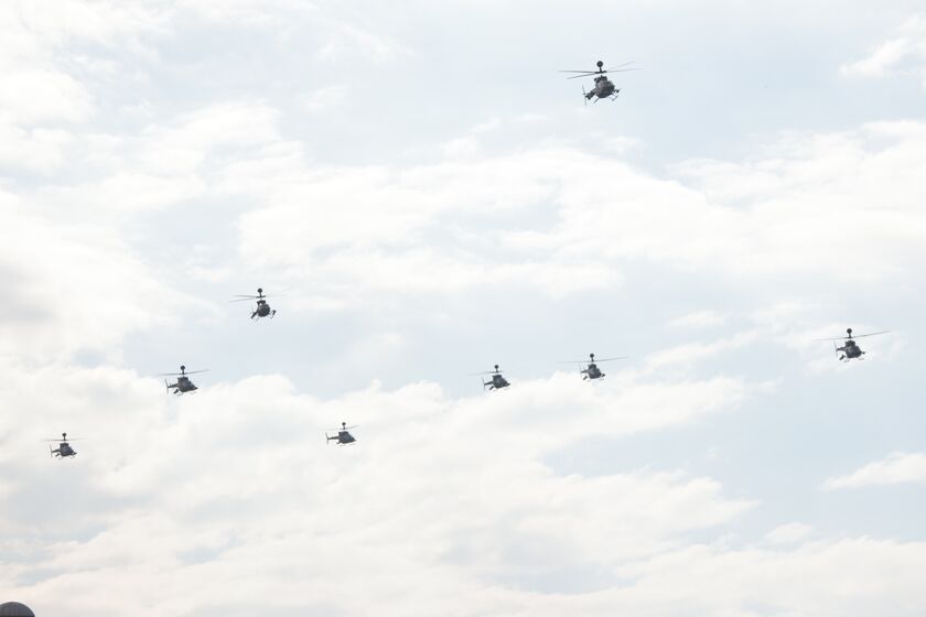 Πάνω από το χώρο της παρέλασης πέταξαν αεροσκάφη και ελικόπτερα της Πολεμικής Αεροπορίας (μεταξύ άλλων μαχητικά F-16 και F-4) καθώς και ελικόπτερα της Αεροπορίας Στρατού (Apache, Chinook, Kiowa Warrior κά), του Πολεμικού Ναυτικού (Sikorsky S-70) και των Σωμάτων Ασφαλείας.