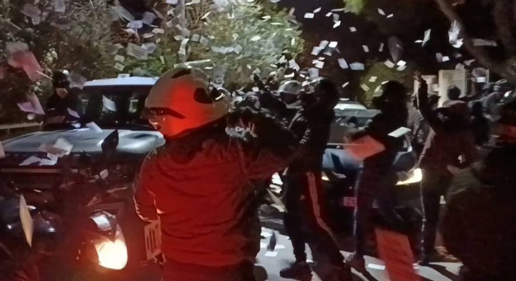 Λίγες ώρες μετά την εκλογή του, μέλη της ομάδας πέταξαν τρικάκια, με μηνύματα για την τραγωδία των Τεμπών, και αποχώρησαν.