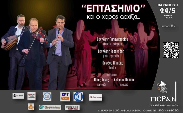 Το ΠΕΡΑΝ το καφέ – αμάν της πόλης, την Παρασκευή 24 Μαΐου και ώρα 22.30, υποδέχεται το «ΕΠΤΑΣΗΜΟ» – μια παραδοσιακή ορχήστρα από εξαιρετικούς δεξιοτέχνες που μας προσκαλούν σ’ ένα μοναδικό λαϊκό γλέντι με τραγούδια και χορούς από διάφορες περιοχές του Ελληνισμού: Κωνσταντινούπολη, Λέσβο, Μικρά Ασία, Κυκλάδες, Εύβοια, Θεσσαλία, Μακεδονία, Ρούμελη και Θράκη.