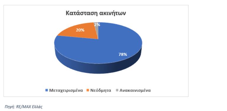 Όσον αφορά στην κατάσταση των οικιστικών ακινήτων, η συντριπτική πλειονότητα των ξένων αγοραστών (ποσοστό 78% επί του συνόλου) επέλεξε μεταχειρισμένα ακίνητα. Τα νεόδμητα καλύπτουν το 20% των αγορών και τα ανακαινισμένα μόλις το 2%.