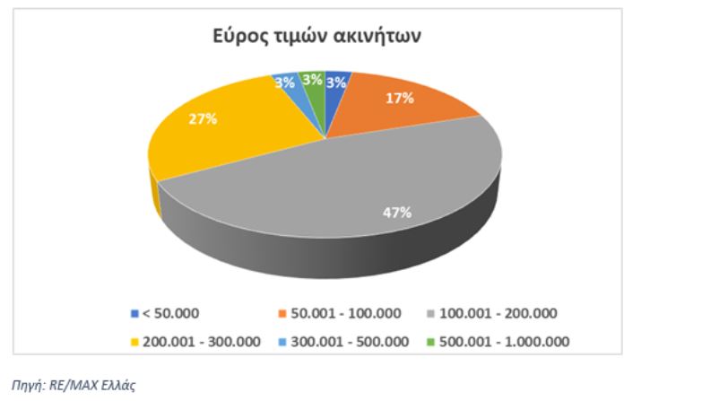 Αξίζει να τονιστεί, ότι το μεγαλύτερο μέρος των συναλλαγών όσον αφορά την αξία του ακινήτου, εντοπίζεται στην κατηγορία μεταξύ 100.001 ευρώ και 200.000 ευρώ (47%), ενώ η κατηγορία ακινήτων αξίας από 200.001 ευρώ έως 300.000 ευρώ επιλέχθηκε από το 27% του συνόλου των ξένων αγοραστών. Την ίδια στιγμή, το 17% των εν λόγω αγοραστών επέλεξαν ακίνητα αξίας από 50.001 ευρώ έως 100.000 ευρώ, ενώ πολύ πιο περιορισμένες είναι οι αγορές για ακίνητα αξίας έως 50.000 ευρώ και για ακίνητα αξίας από 300.001 ευρώ έως 500.000 ευρώ και από 500.001 έως 1.000.000 (το ποσοστό για την κάθε κατηγορία ανέρχεται σε 3%).