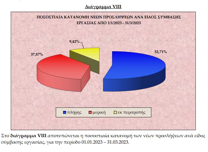 Από τις θέσεις εργασίας που δημιουργήθηκαν το πρώτο τρίμηνο του 2023 ( Ιανουαρίου-Μαρτίου), το 52,7 1%  ήταν πλήρους  απασχόλησης , ενώ το 37,87% ήταν μερικής απασχόλησης και το 9,42% ήταν εκ περιτροπής,  δηλαδή το 47,29  % ήταν ευέλικτης μορφής εργασίας.