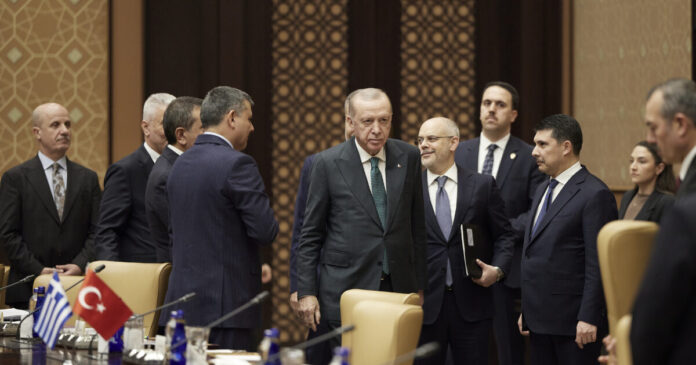 Σε κοινές δηλώσεις μετά τη συνάντησή τους και τη συνεδρίαση του 6ου Ανώτατου Συμβουλίου Συνεργασίας Ελλάδας – Τουρκίας, προχώρησαν το απόγευμα της Τετάρτης (11.02.2026) ο Κυριάκος Μητσοτάκης και ο Ρετζέπ Ταγίπ Ερντογάν. Ο Τούρκος πρόεδρος καλωσόρισε τον Έλληνα πρωθυπουργό, κάνοντας λόγο για συνέχιση του διαλόγου και για «κοινό έδαφος» που, όπως είπε, δημιουργούν οι συμφωνίες των δύο πλευρών για την ενίσχυση των αμοιβαίων επαφών.