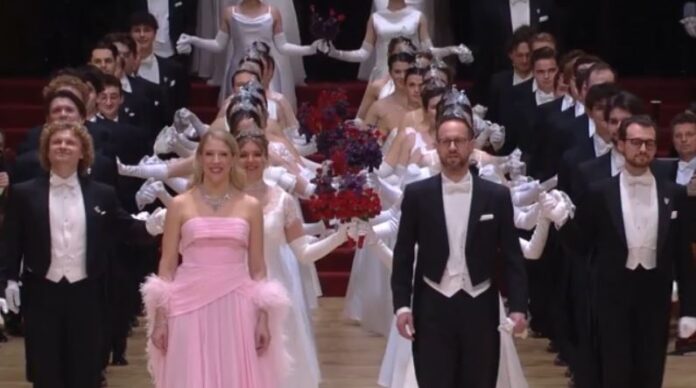 Τα πανέμορφα ζευγάρια με κατάλευκες τουαλέτες και μαύρα σμόκιν ανοίγουν την εκδήλωση στον ετήσιο χορό της Όπερας της Βιέννης.