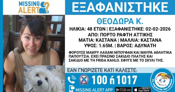 Συγκεκριμένα στις 02/02/2026, πρωινές ώρες, εξαφανίστηκε από την περιοχή του Πόρτο Ράφτη στην Αθήνα η Θεοδώρα Κ., 48 ετών και το «Χαμόγελο του Παιδιού» ενημερώθηκε σήμερα, 06/02/2026, για την εξαφάνιση της.