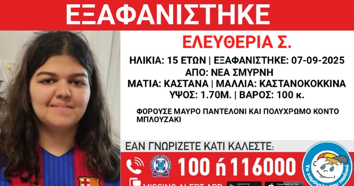 Εξαφανίστηκε η 15χρονη Ελευθερία από δομή φιλοξενίας στη Νέα Σμύρνη το μεσημέρι της Κυριακής 7 Σεπτεμβρίου σύμφωνα με το σύμφωνα με το «Χαμόγελο του Παιδιού».