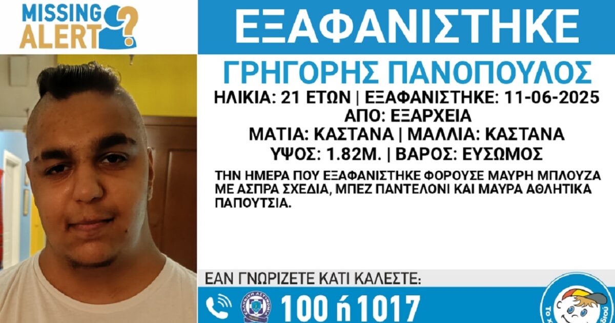 Αγωνία για την εξαφάνιση του 21χρονου Γρηγόρη Πανόπουλου από την Αθήνα με το «Χαμόγελο του Παιδιού» να προχωρά στην δημοσιοποίηση των στοιχείων.