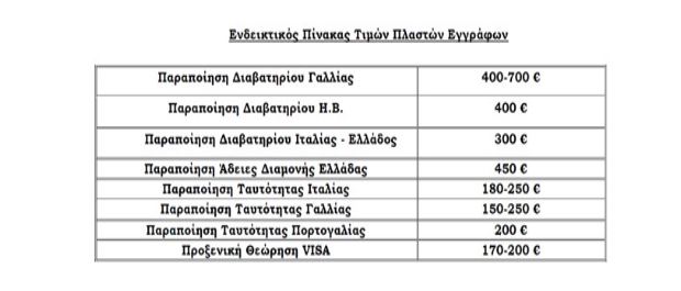 Μάλιστα, τα μέλη του κυκλώματος, διακινούσαν έγγραφα διεθνώς με τη χρήση ταχυδρομικών υπηρεσιών ενώ οι τιμές διαφοροποιούνταν ανάλογα με το είδος και τη χώρα προέλευσης του εγγράφου αλλά και την ποσότητα της εκάστοτε παραγγελίας, όπως φαίνεται στον πίνακα που ακολουθεί: