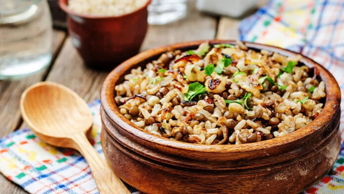 Αφήστε το ρύζι και τις φακές να ξεκουραστούν σκεπασμένες για περίπου 10 λεπτά χωρίς να τις πειράξετε, στη συνέχεια γαρνίρετε με μαϊντανό και μεταφέρετε σε μπολ σερβιρίσματος. Τοποθετήστε σε κάθε μπολ τις τραγανές ροδέλες κρεμμυδιού.