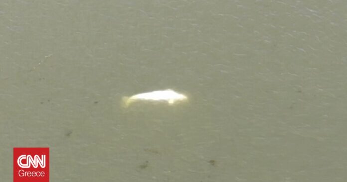 Σε οπτικό υλικό από drone φαίνεται η μπελούγκα να αναδύεται περιστασιακά στην επιφάνεια και να κολυμπά νωχελικά.