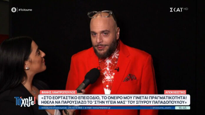 Μιλώντας στην κάμερα της εκπομπής, ο Φάνης Λαμπρόπουλος δεν έκρυψε το χιούμορ του, περιγράφοντας το εορταστικό επεισόδιο με τον δικό του τρόπο.