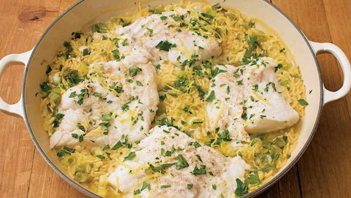 6. Τοποθετήστε τα κομμάτια του ψαριού πάνω από τα λαχανικά και το κριθαράκι, ραντίστε με λίγο ελαιόλαδο, αλατοπιπερώστε και μαγειρέψτε για 3-4 λεπτά μέχρι να μαλακώσει το ψάρι.