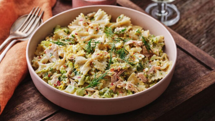 Μόλις βράσουν τα ζυμαρικά, τα σουρώνουμε και τα προσθέτουμε στα υπόλοιπα υλικά.