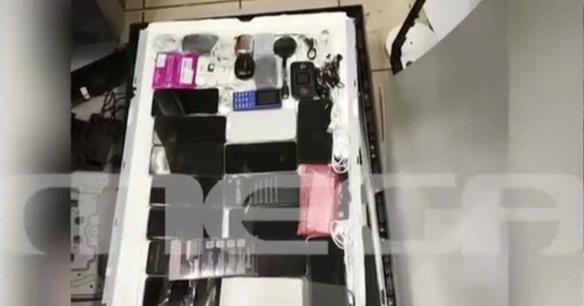 Συνολικά εντός της τηλεόρασης είχαν τοποθετηθεί επιμελώς 22 κινητά τηλέφωνα, 11 φορτιστές, 5 ακουστικά, 8 ρούτερ για wifi και κάρτες sim.
