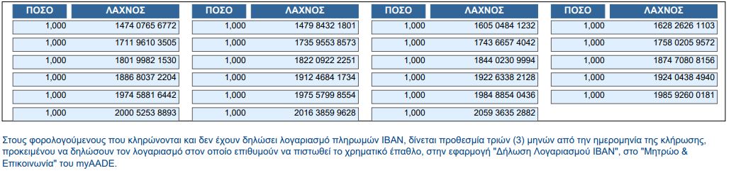 Όπως έχει διευκρινίσει η Ανεξάρτητη Αρχή Δημοσίων Εσόδων, το ποσό των 100.000 ευρώ που θα λάβει ο κάθε τυχερός θα είναι αφορολόγητο, δεν θα αποτελεί εισόδημα και δεν θα υπόκειται σε καμιά κράτηση υπέρ του Δημοσίου ή τρίτου, ενώ παράλληλα, θα δοθούν και ποσά των 1.000 ευρώ σε τυχερούς πολίτες.