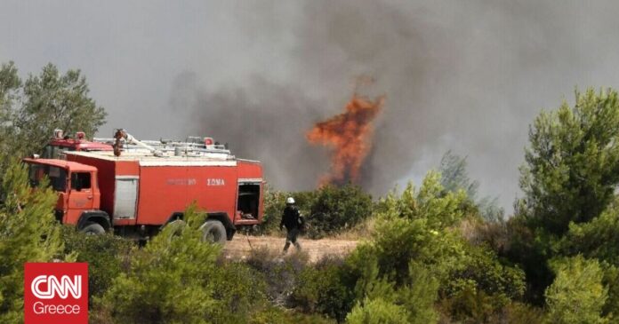 Η φωτιά καίει δασική έκταση ενώ στο σημείο έχουν σπεύσει 13 πυροσβέστες με 5 οχήματα.