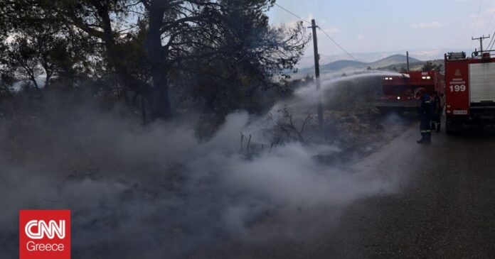 Σύμφωνα με ενημέρωση που είχε το CNN Greece από το γραφείο τύπου της Πυροσβεστικής Υπηρεσίας, η φωτιά καίει ξερά χόρτα και βλάστηση.