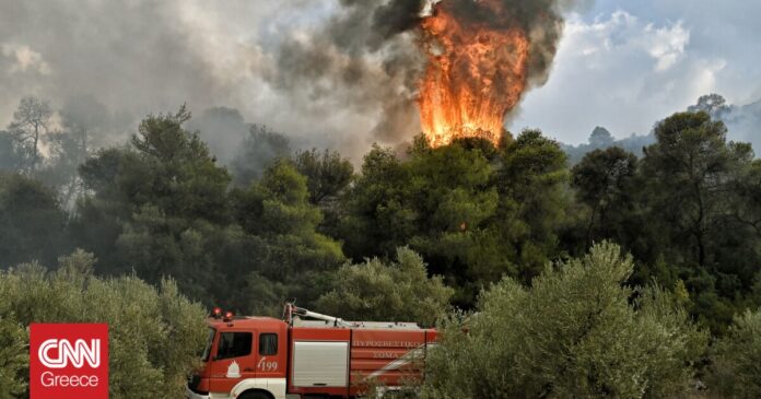 Η φωτιά μαίνεται σε δασική έκταση και έχει λάβει διαστάσεις.