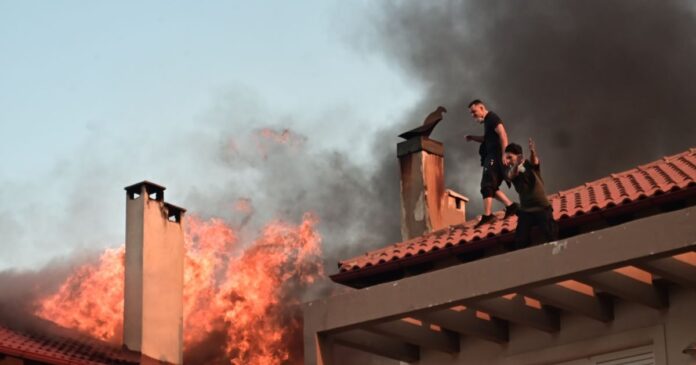 Από την θηριώδη φωτιά, δεκάδες σπίτια τυλίχτηκαν στις φλόγες στα όρια Δροσοπηγής – Κρυονερίου, και συγκεκριμένα κοντά στην οδό Ζωοδόχου Πηγής.