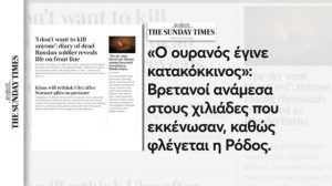 «’Ο ουρανός έγινε κατακόκκινος’: Βρετανοί ανάμεσα στους χιλιάδες που εκκένωσαν, καθώς φλέγεται η Ρόδος», γράφουν οι Times.