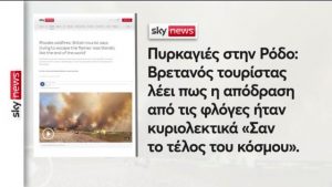 «Πυρκαγιές στην Ρόδο: Βρετανός τουρίστας λέει πως η απόδραση από τις φλόγες ήταν κυριολεκτικά ‘Σαν το τέλος του κόσμου’», αναφέρει το Sky News.