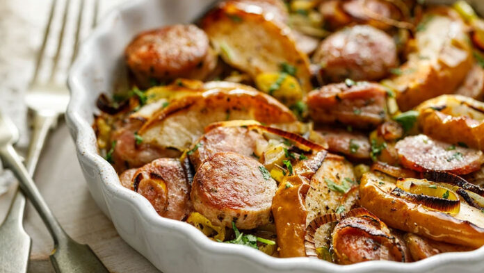 Δυναμώστε τη φωτιά και προσθέστε τα λουκάνικα. Μαγειρέψτε για λίγα λεπτά μέχρι να ροδίσουν παντού, στη συνέχεια μειώστε τη φωτιά σε μέτρια, πασπαλίστε με τα μπαχαρικά και αλατοπιπερώστε καλά.