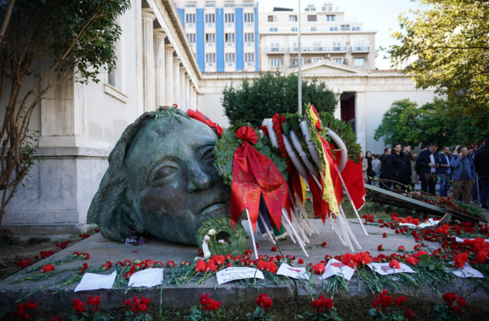 Γονείς και δάσκαλοι συνοδεύουν μαθητές στην προτομή – σύμβολο του αγώνα για Δημοκρατία και Ελευθερία. Η ιστορία μεταδίδεται, οι αξίες μεταλαμπαδεύονται στις νέες γενιές.